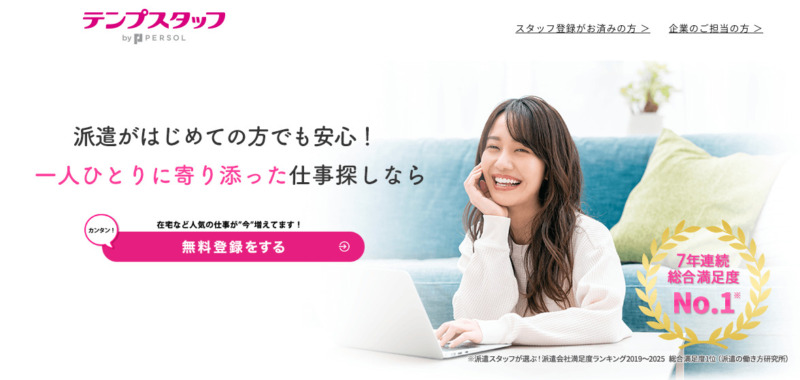 スタッフサービスは求人数が業界No1のため、希望にピッタリ合う仕事が見つかりやすい&紹介数が多いです。そのため、初めての派遣の方と条件重視の方におすすめです。